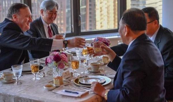 Suasana hangat saat Pompeo dan Yong Chol makan malam bersama di New York. (Foto: The State Department)