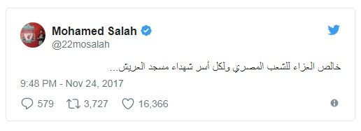 Bintang Liverpool Mohamed Salah juga menyampaikan rasa duka cita atas tragedi yang berlangsung Jumat, 24 November 2017 tersebut. "Ucapan belasungkawa tulus saya kepada orang-orang Mesir dan semua keluarga para martir Masjid Al-Arish,” tulisnya.