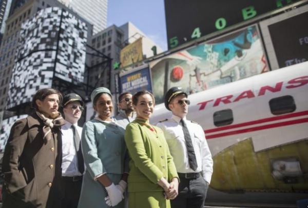 Para aktor mengenakan busana pilot, kru kabin, dan mekanik dari tahun 1960an dan 70an. Mereka berpose di samping Lockheed Constellation L-1649A Starliner, atau dikenal dengna nama “Connie, yang parkir di Times Square di New York, untuk acara promosi, Sabtu, 23 Maret 2019. (FOTO: AP)