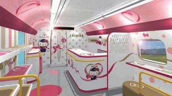 Interiornya juga menampilkan gambar karakter kartun Hello Kitty yang mengenakan seragam kru atau membawa produk khusus lokal. Gambar ini terdapat di dinding, kursi, dan tirai kereta.
