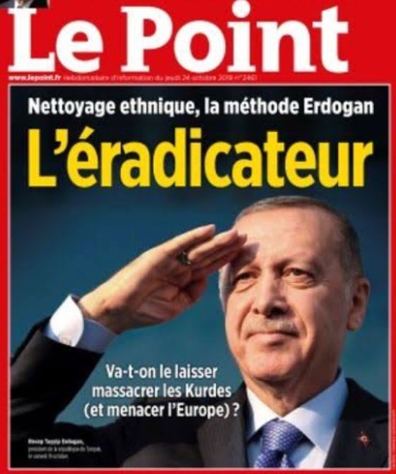 Pada sampul terbitan pekan ini, Le Point menunjukkan Erdogan sedang memberi hormat. Terbitan itu berjudul "Pembasmian Etnis: metode Erdogan".