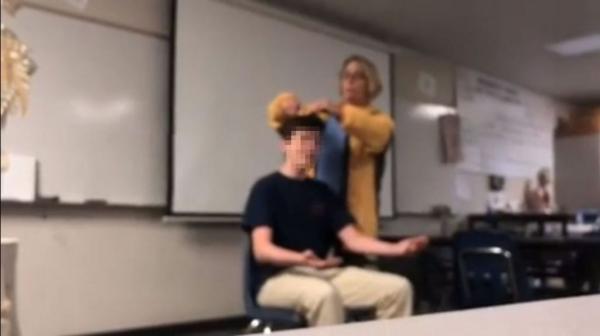 Margaret Gieszinger saat menggunting rambut siswanya secara paksa di kelas. (Foto: Youtube)