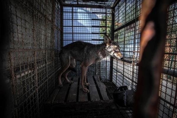 Seekor serigala terlihat di kandang kecil yang dikelilingi oleh kotoran di 'taman safari neraka' di Fier, Albania. (Foto: Caters News Agency)