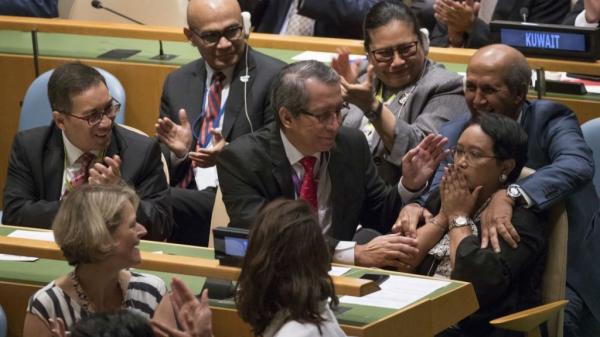 Reaksi Menlu RI, Retno Marsudi saat Indonesia ditetapkan sebagai Anggota DK PBB, 8 Juni 2018. (Foto: AP)