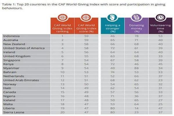 Laporan itu menyuguhkan 146 negara dengan tiga kategori yang menjadi parameter pemeringkatan. Indonesia berada di urutan puncak dengan skor CAF World Giving Index sebesar 59 persen.