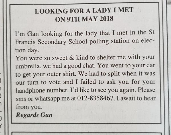 Perempuan itu, kata dia, imut dengan rambut pendek dan memiliki tinggi sekitar 160 sentimeter. Gan berharap "wanita payung" akan melihat iklan tersebut dan menghubunginya.
