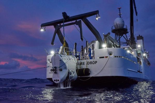 Setelah mencetak rekor, kapal selam diangkut oleh kapal induknya, DSSV Pressure Drop. (FOTO: REEVE JOLLIFFE)