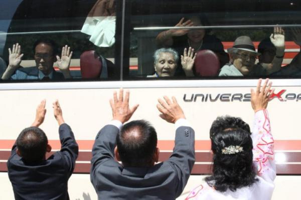 Setelah warga Korsel naik bus untuk kembali menyeberangi DMZ, beberapa kerabat mereka asal Korut diizinkan keluar untuk melambaikan tangan dan mengucapkan selamat tinggal. Para perempuan usia lanjut itu kebanyakan mengenakan pakaian tradisional Korea.