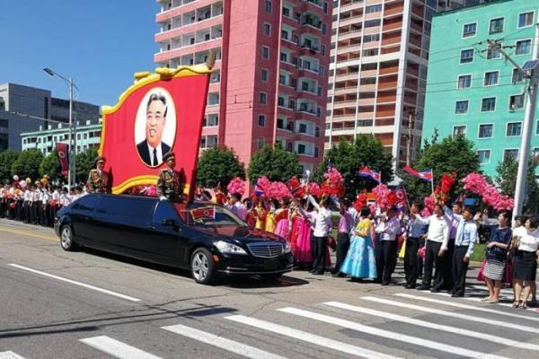 Parade di jalan yang mengusung potret besar Pendiri Korea Utara Kim Il Sung. (Facebook: Andry Yuwono)