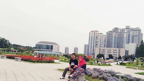 Andry Yuwono bersama istrinya saat berkunjung ke salah satu taman kota di Pyongyang. (Facebook: Andry Yuwono)