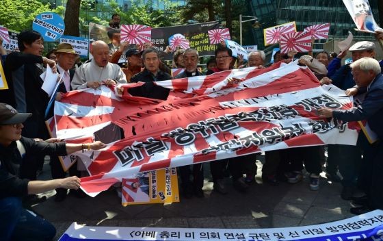 (Demonstran Korsel menyobek bendera Matahari Terbit di Seoul /AFP)