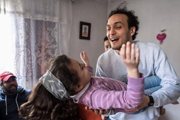 Jurnalis foto Mesir Mahmoud Abu Zeid, yang dikenal luas sebagai Shawkan, bermain dengan keponakannya di rumahnya di Kairo pada 4 Maret. (Khaled Desouki/AFP/Getty Images)