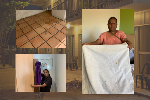 Kamar khusus untuk tamu aborijin tampak kotor dengan sisa makanan dan ada bercak pada seprainya. (ABC: Hamish Harty & Oliver Gordon)