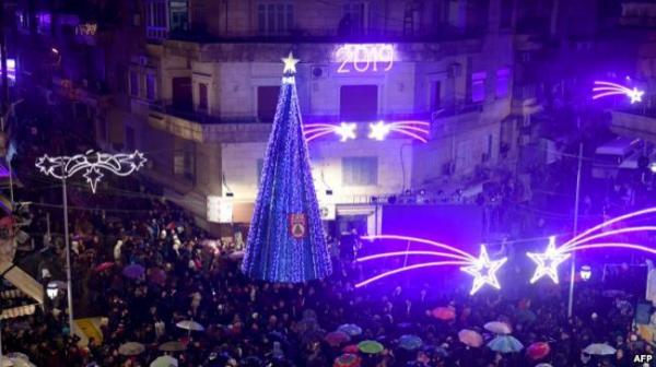 Penyalaan lampu Pohon Natal di Al-Azizzieh Square, Aleppo, Suriah pada 23 Desember 2018.