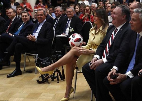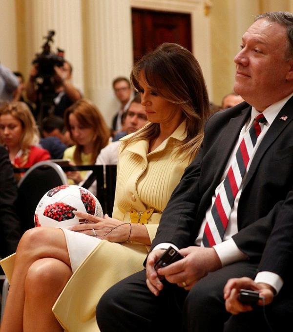 Namun bola itu lolos dari tangan Melania dan terpental di lantai. Bola itu ditangkap oleh Menteri Luar Negeri Mike Pompeo, yang duduk di sebelah Melania, lalu menyerahkannya kepadanya.