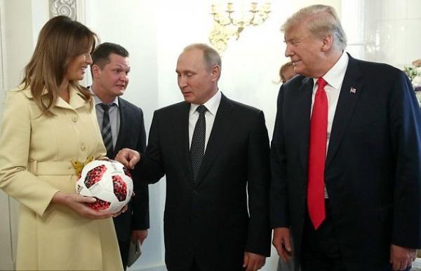 Momen saat Trump Melempar Bola Piala Dunia Hadiah Putin ke Istrinya