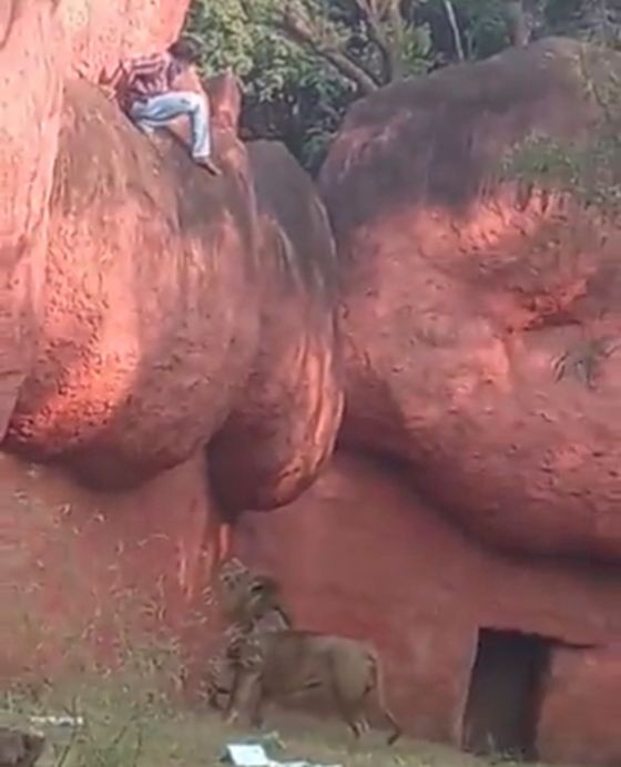 Dalam video tampak Kumar duduk di batu berjarak hanya beberapa meter dari singa. Kucing besar itu juga tampak menunggu Kumar di bawah, sesakali berusaha akan lompat menjangkaunya.