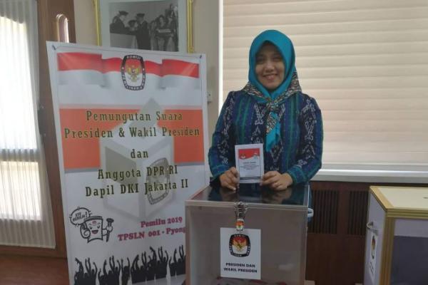 Seorang warga Indonesia memberikan suaranya dalam Pemilu 2019 yang digelar di Gedung Kedubes RI di Pyongyang, Sabtu 13 April 2019. (foto: doc. Andry Yuwono)
