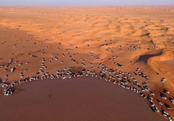 Fenomena langka tersebut sontak mengundang perhatian ribuan warga. Area yang sebelumnya hanya berupa gurun pasir kini dipenuhi air, menciptakan lansekap kontras yang jarang terlihat di kawasan gurun.