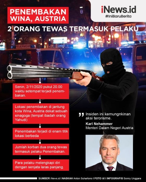 WINA, iNews.id - Penembakan di Wina, Austria, Senin (2/11/2020) malam waktu setempat, terjadi di enam lokasi menewaskan dua orang termasuk pelaku.