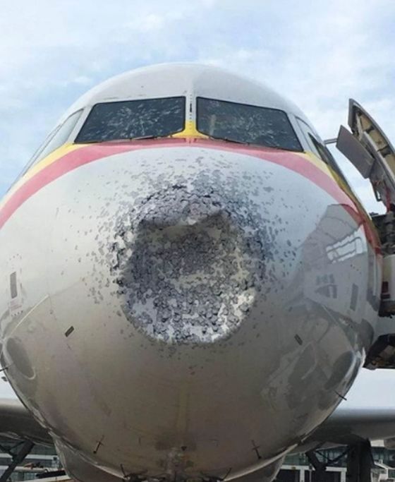 (Hidung pesawat Tianjin Airlines penyok akibat badai es/Foto: Weibo)