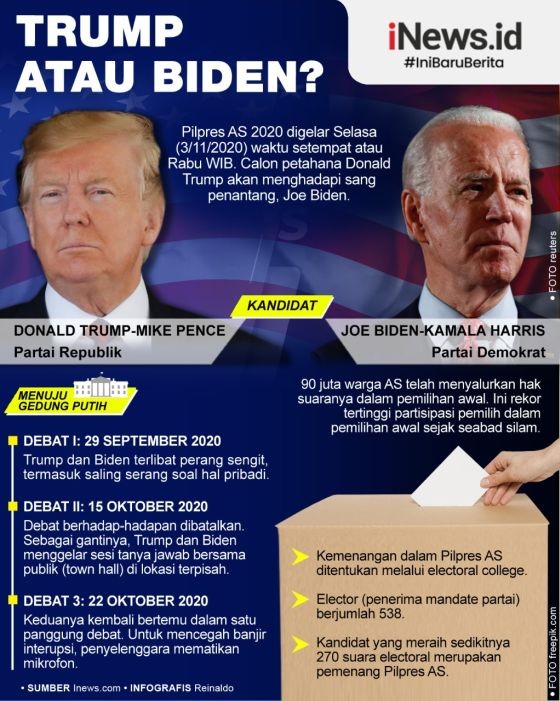 WASHINGTON DC, iNews.id – Pemilu Amerika Serikat tinggal menghitung jam. Sampai hari ini, hasil polling (jajak pendapat) tingkat nasional dan di sebagian besar negara bagian AS masih mengunggulkan calon presiden dari Partai Demokrat, Joe Biden.