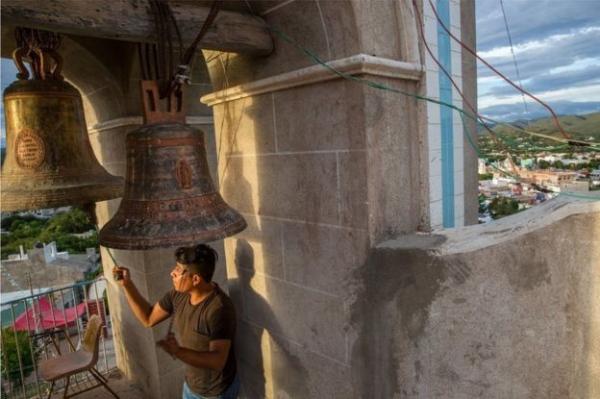 Seorang pria membunyikan lonceng gereja kota, lonceng yang dibunyikan untuk menghimpun kerumunan orang pada hari itu. (Foto: BRETT GUNDLOCK)