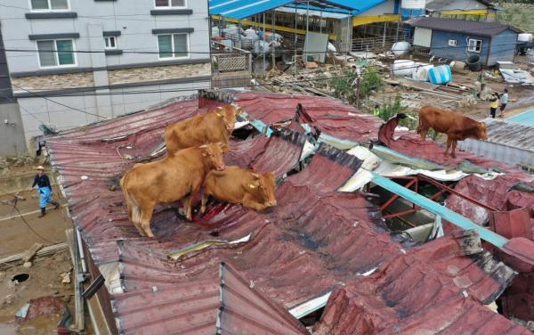 AFP melansir, sapi-sapi itu mengambang ke atas rumah warga saat air banjir meninggi pada akhir pekan lalu di Gurye, sebuah kota pertanian di selatan Korsel. Hewan-hewan itu bergegas menyelamatkan diri di atas atap beberapa rumah dan bangunan lainnya, begitu mereka mendapatkan tempat untuk mendarat.