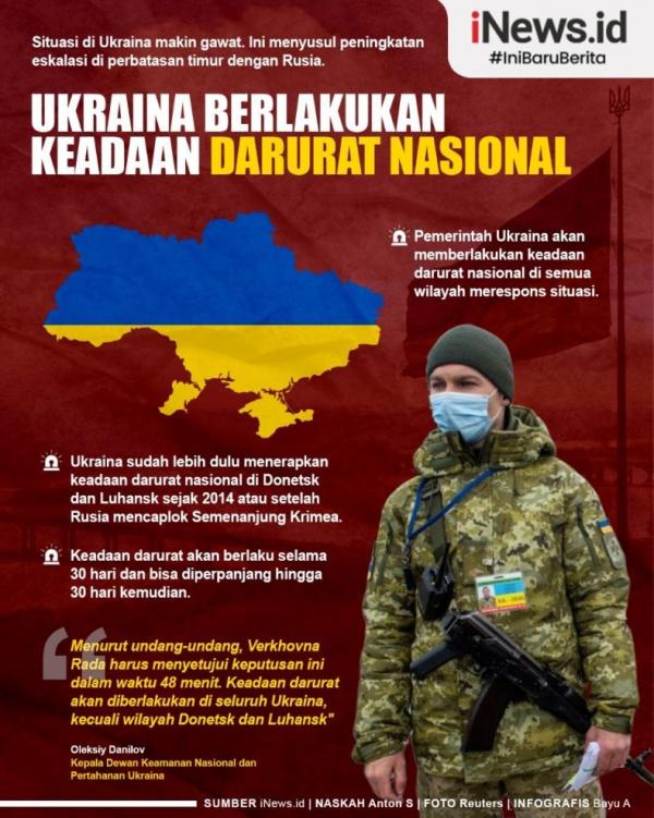 KIEV, iNews.id - Ukraina memberlakukan keadaan darurat nasional di semua wilayah menyusul peningkatan eskalasi di perbatasan timur dengan Rusia. Pengetatan akan diberlakukan yang tensinya disesuaikan dengan kondisi di masing-masing wilayah.