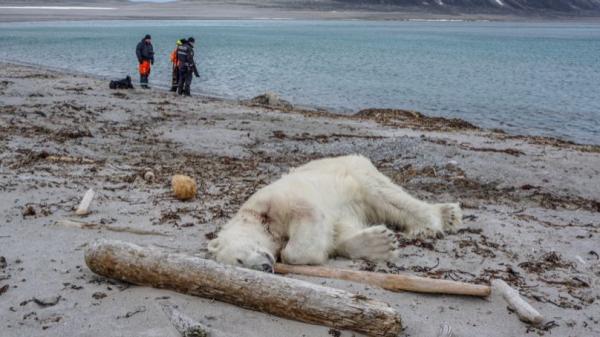 Seekor beruang kutub yang mati setelah ditembak oleh seorang karyawan perusahaan pelayaran. (Foto: AP)