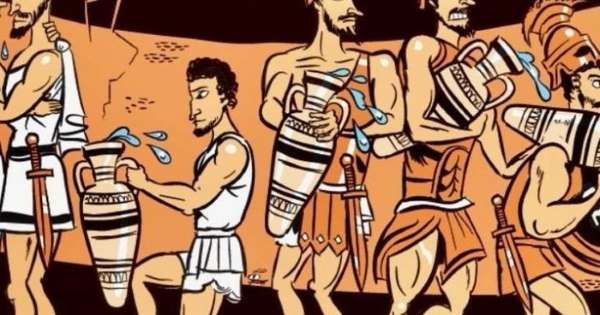 Kartun yang dibuat oleh Jos Valdman itu menggambarkan para pejuang kuno Yunani mencoba memadamkan api mengunakan vas keramik. (Foto: The Advertiser)