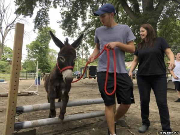 Pengunjung Taman Keledai, Evan Oster, menuntun seekor keledai melalui halang rintang didampingi relawan Patti Lundgren di Taman Keledai, di Ulster Park, New York. (Foto: AP)