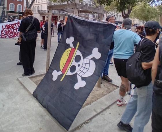 Seorang demonstran di Montpellier terlihat membawa bendera mirip One Piece yang sepertinya dibuat secara manual. Meski demikian, idenya tampak serupa dengan karakter anime Jepang tersebut. Pemandangan serupa juga terlihat di Marseille.