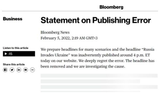 Dalam pernyataan, media milik miliarder Michael Bloomberg itu menyesalkan insiden tersebut serta menjelaskan alasannya. Disebutkan redaksi telah menyiapkan tulisan untuk beberapa skenario soal serangan Rusia ke Ukraina, salah satunya berjudul 'Rusia Menyerang Ukraina'. Namun terjadi kesalahan sehingga judul tersebut tayang.