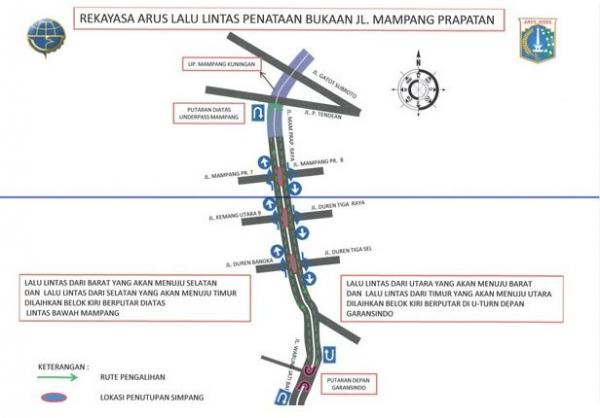 Dia menjelaskan, ada beberapa rekayasa lalu lintas yang disiapkan instansinya pascapenutupan tiga simpang empat di Jalan Mampang Prapatan nanti. Pertama, penutupan dilakukan di simpang Jalan Mampang Prapatan Raya–Jalan Mampang Prapatan 7–Jalan Mampang Prapatan 8. Lalu lintas dari arah utara menuju barat yang semula belok kanan menuju Jalan Mampang Prapatan 7, dialihkan lurus ke selatan untuk kemudian berputar di putaran depan Garansindo.Selanjutnya, lalu lintas dari arah timur ke barat yang semula lurus menuju Jalan Mampang Prapatan 7, atau; dari arah timur ke utara yang semula belok kanan menuju Kuningan, akan dialihkan belok kiri untuk berputar di putaran depan Garansindo. Sementara, lalu lintas dari arah barat menuju selatan yang semula belok kanan menuju Ragunan, dialihkan belok kiri untuk berputar di atas putaran lintas bawah Mampang.Kedua, penutupan dilakukan di simpang Jalan Mampang Prapatan Raya–Jalan Duren Tiga Raya–Jalan Kemang Utara 9. Lalu lintas dari arah utara menuju barat yang semula belok kanan menuju ke Jalan Kemang Utara 9, dialihkan lurus ke selatan untuk kemudian berputar di putaran depan Garansindo.Lalu lintas dari arah timur menuju barat yang semula lurus menuju Jalan Kemang Utara 9, atau; dari arah timur ke utara yang semula belok kanan menuju Kuningan, dialihkan belok kiri untuk berputar di putaran depan Garansindo. Sementara, lalu lintas dari arah barat menuju selatan yang semula belok kanan menuju Ragunan, dialihkan belok kiri untuk berputar di atas putaran lintas bawah Mampang.