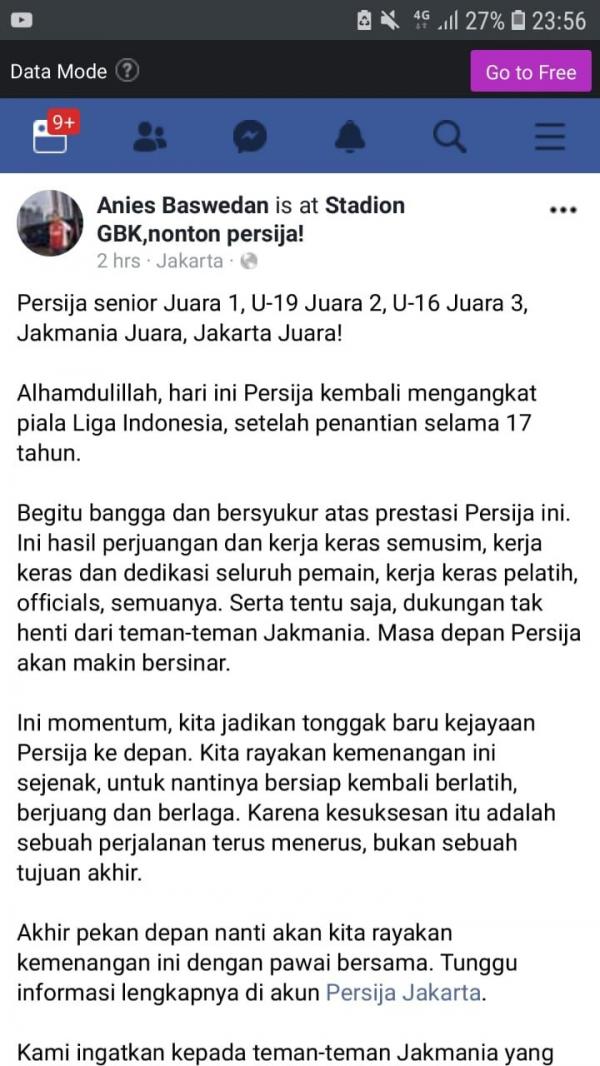 Kegembiraan itu diungkapkan Anies melalui akun media sosial Facebook resmi miliknya dengan tulisan berjudul Persija Senior Juara 1, U-19 Juara 2, U-16 Juara 3, Jakmania Juara, Jakarta Juara!.