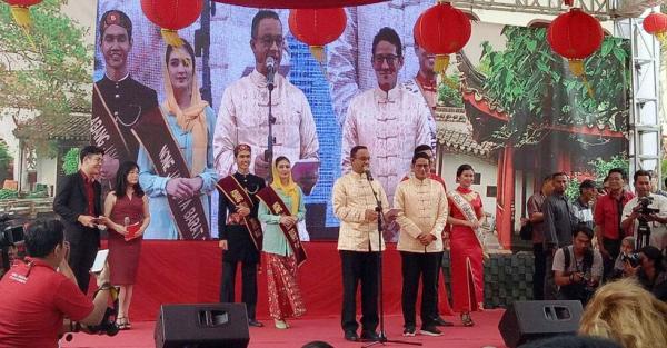 Anies yang datang pukul 15.30 WIB disambut alunan musik betawi dan ondel-ondel. Tak lamu kemudian wakil gubernur Sandiaga tiba. Kemeriahan mewarnai suasana perayaan Cap Go Meh itu.