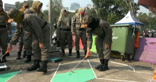 Begini Aksi Puluhan Satpol PP Perempuan Mengecat Trotoar Monas