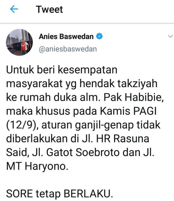 “Untuk beri kesempatan masyarakat yg hendak takziyah ke rumah duka alm. Pak Habibie, maka khusus pada Kamis PAGI (12/9), aturan ganjil-genap tidak diberlakukan di Jl. HR Rasuna Said, Jl. Gatot Soebroto dan Jl. MT Haryono. SORE tetap BERLAKU,” tulis Anies melalui akun Twitter-nya yang telah terverifikasi, menjelang tengah malam tadi.