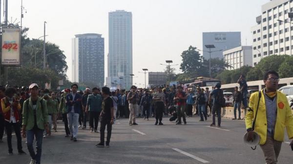 Masiswa dari sejumlah universitas di Jakarta yang menamakan diri Aliansi Masyarakat Sipil berdemonstrasi di depan Gedung DPR, Jakarta Kamis (19/9/2019). (Foto: iNews.id).