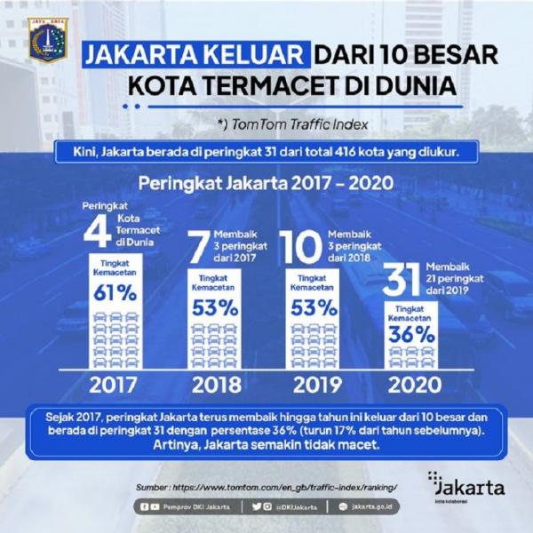 "Terima kasih kepada seluruh masyarakat Jakarta. Menurut Tom Tom Traffic Index terbaru, Jakarta keluar dari 10 besar kota termacet di dunia. Kini, kemacetan Jakarta jauh berkurang, berada di posisi ke-31 dari total 416 kota lain," demikian cuitan akun twitter @DKIJakarta yang diunggah pada Minggu (17/1/2021).