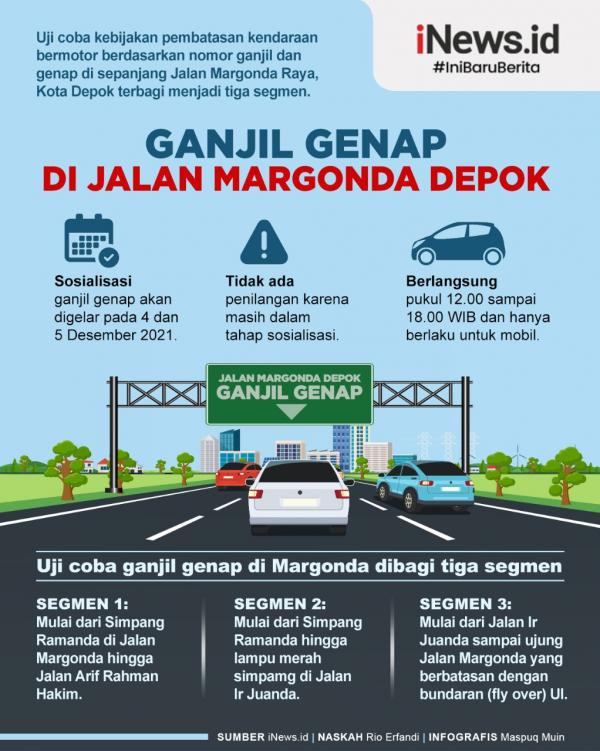 DEPOK, iNews.id - Uji coba kebijakan pembatasan kendaraan bermotor berdasarkan nomor ganjil dan genap (gage) di sepanjang Jalan Margonda Raya, Kota Depok terbagi menjadi tiga segmen. Kebijakan itu akan berlaku mulai 4 Desember 2021.