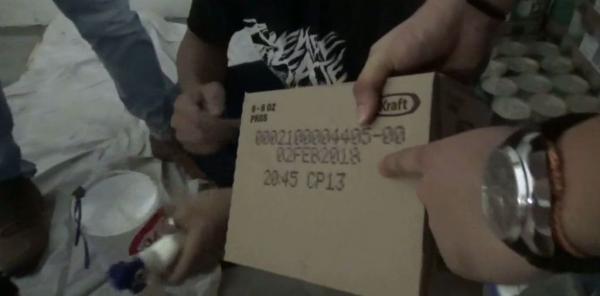 Saat memasuki gudang, petugas menemukan tumpukan makanan yang sudah kedaluwarsa. Seperti mayones, biskuit, dan keju. Sementara itu, pegawai gudang setempat mengganti label makanan yang sudah kedaluwarsa dengan yang baru.