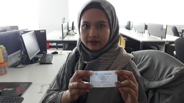 Salah satu karyawan menunjukkan tiket layanan Transjakarta gratis bertepatan dengan HUT ke-492 Jakarta.