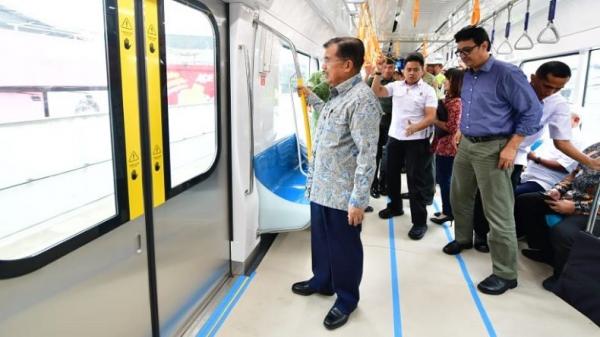 JAKARTA, iNews.id - Wakil Presiden Jusuf Kalla (JK) mencoba moda transportasi mass rapid transit (MRT) relasi Bundaran Hotel Indonesia-Lebak Bulus, Rabu (20/2/2019). Sebelum menjajal kereta itu, JK meninjau perkembangan pembangunan Stasiun MRT Pintu Bundaran HI.