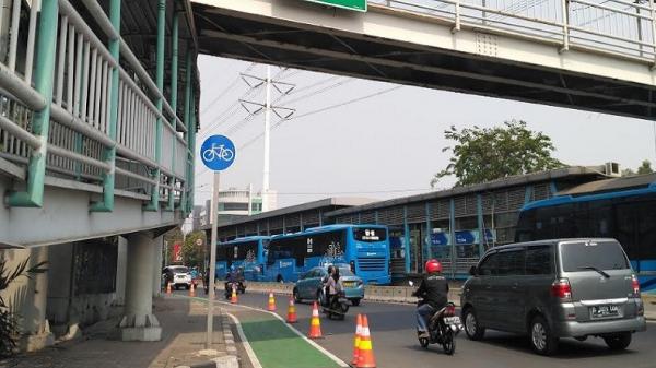 Seperti terpantau di sepanjang Jalan Pemuda hingga Jalan Pramuka, Jakarta Timur, Senin (23/9/2019) siang. Di beberapa titik, jalur khusus sepeda itu jadi tempat pemberhentian ojol. Mereka dengan santai berhenti untuk menurunkan atau menunggu penumpang yang menghampiri.