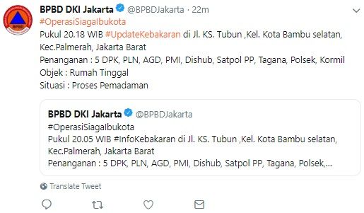 “Pukul 20.18 WIB, kebakaran Jalan KS Tubun, Kota Bambu Selatan, Palmerah. Penanganan lima DPK, PLN, AGD, PMI, Dishub, Satpol PP, Tagana, Polsek, Koramil. Objek rumah tinggal, situasi proses pemadaman,” tulis @BPBD Jakarta, Minggu (16/12/2018).