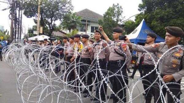 Sementara personel kepolisian sudah siaga sejak awal di depan Kantor KPU lengkap dengan penghalang dari kawat berduri.