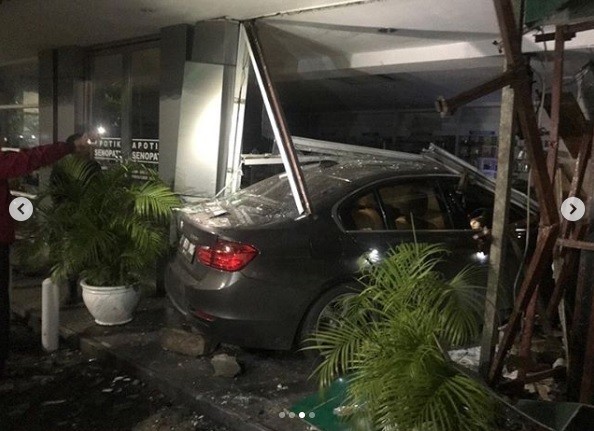 Berdasarkan video pendek yang diunggah TMC, mobil BMW warna hitam diinformasikan melaju dari arah Selatan. Mobil menyeruduk bagian depan apotik, menghancurkan kaca dan sebagian bangunan.