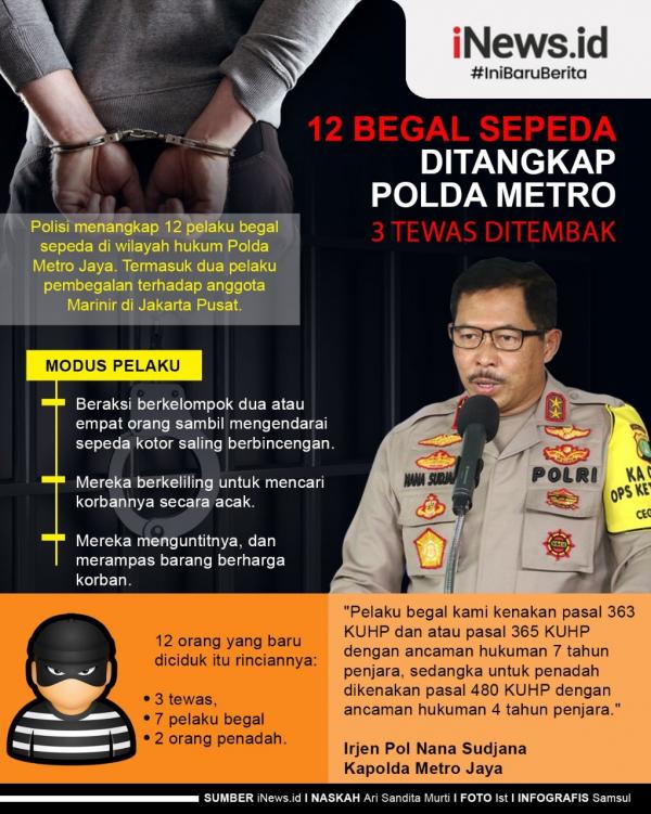 JAKARTA, iNews.id - Polisi menangkap 12 pelaku begal sepeda di wilayah hukum Polda Metro Jaya. Termasuk dua pelaku pembegalan terhadap anggota Marinir di Jakarta Pusat.